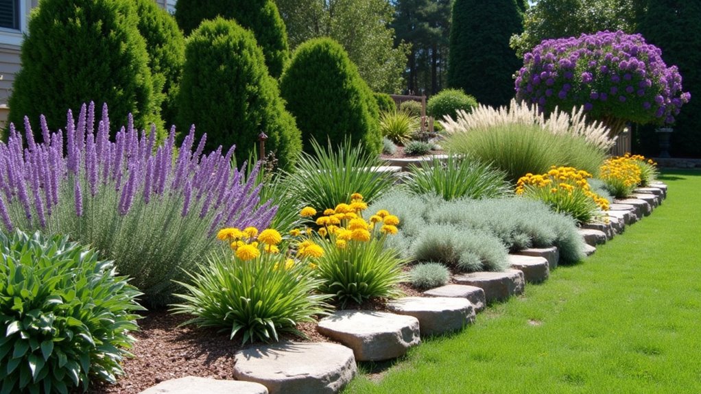 You’ll find excellent year-round performance from drought tolerant perennials like Echinacea and Salvia, which maintain their root structure through winter. Heat loving succulents, including Sempervivum and Sedum species, offer perpetual foliage interest while requiring minimal irrigation. Incorporate evergreen shrubs such as Nandina domestica and Camellia japonica for consistent structure. Low water ground covers like Juniperus horizontalis provide permanent soil coverage and erosion control in challenging terrain.