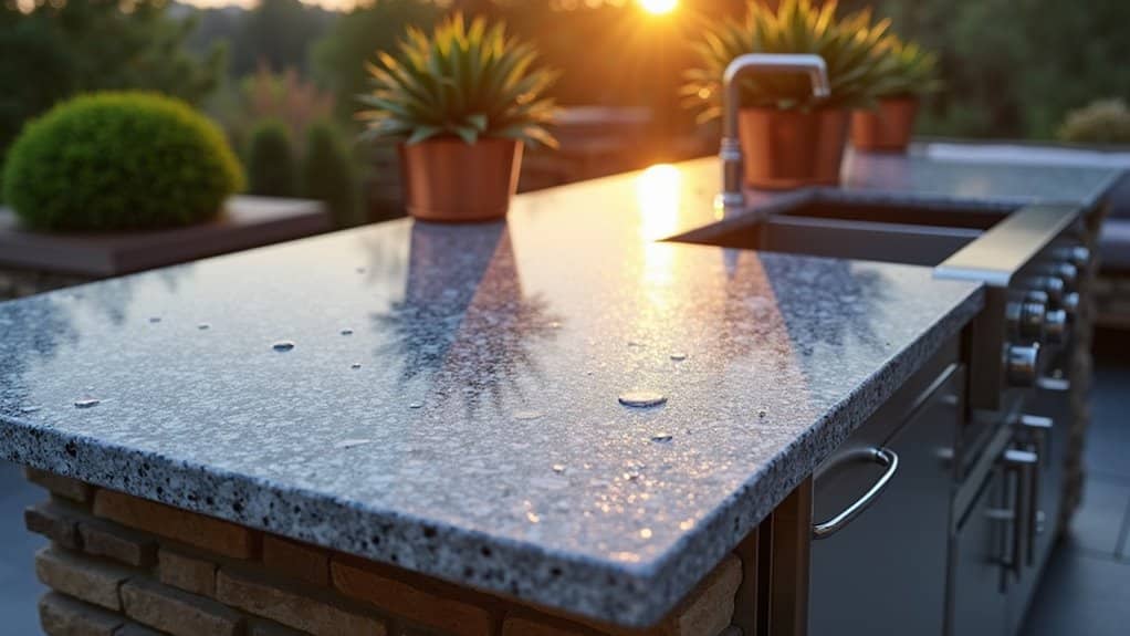 For your outdoor kitchen, you’ll want to prioritize granite or quartzite as they’re the most weather resistant materials available. They offer exceptional UV resistant finishes and high heat tolerance while requiring minimal maintenance. If you’re looking for antimicrobial properties, consider stainless steel, though it can get hot in direct sunlight. All these materials feature scratch resistant coatings and stain proof characteristics, making them ideal for outdoor cooking spaces.